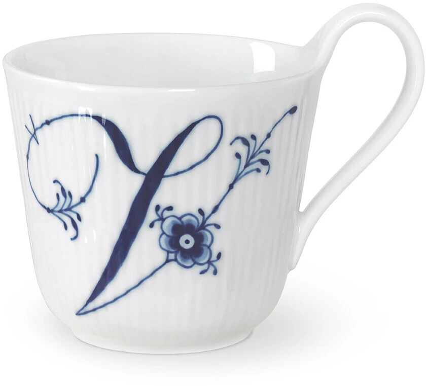 På Alfabetkruset er den klassiske Royal Copenhagen højhankskop dekoreret med et håndmalet ’V’ på den ene siden og blomsterdekorationer på den anden side. Alfabetkruset ’V’ er den perfekte gave til en, du holder af. De klassiske højhankskopper i Alfabetkollektionen er dekoreret med et håndmalet bogstav og blå palmetter, der gør hver en kop til en særlig og personlig gave.