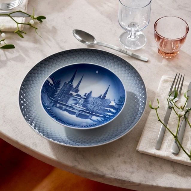 Roskilde Domkirke er et af de mest betydningsfulde monumenter i Danmark og har været på UNESCOs verdensarvsliste siden 1995. På Bing & Grøndahls årlige juleplatte 2023 er Domkirken og den omkringliggende grund dækket af pulverhvid sne. Det detaljerede motiv i dybe blå og hvide farver er skabt af kunstneren Dag Samsund.