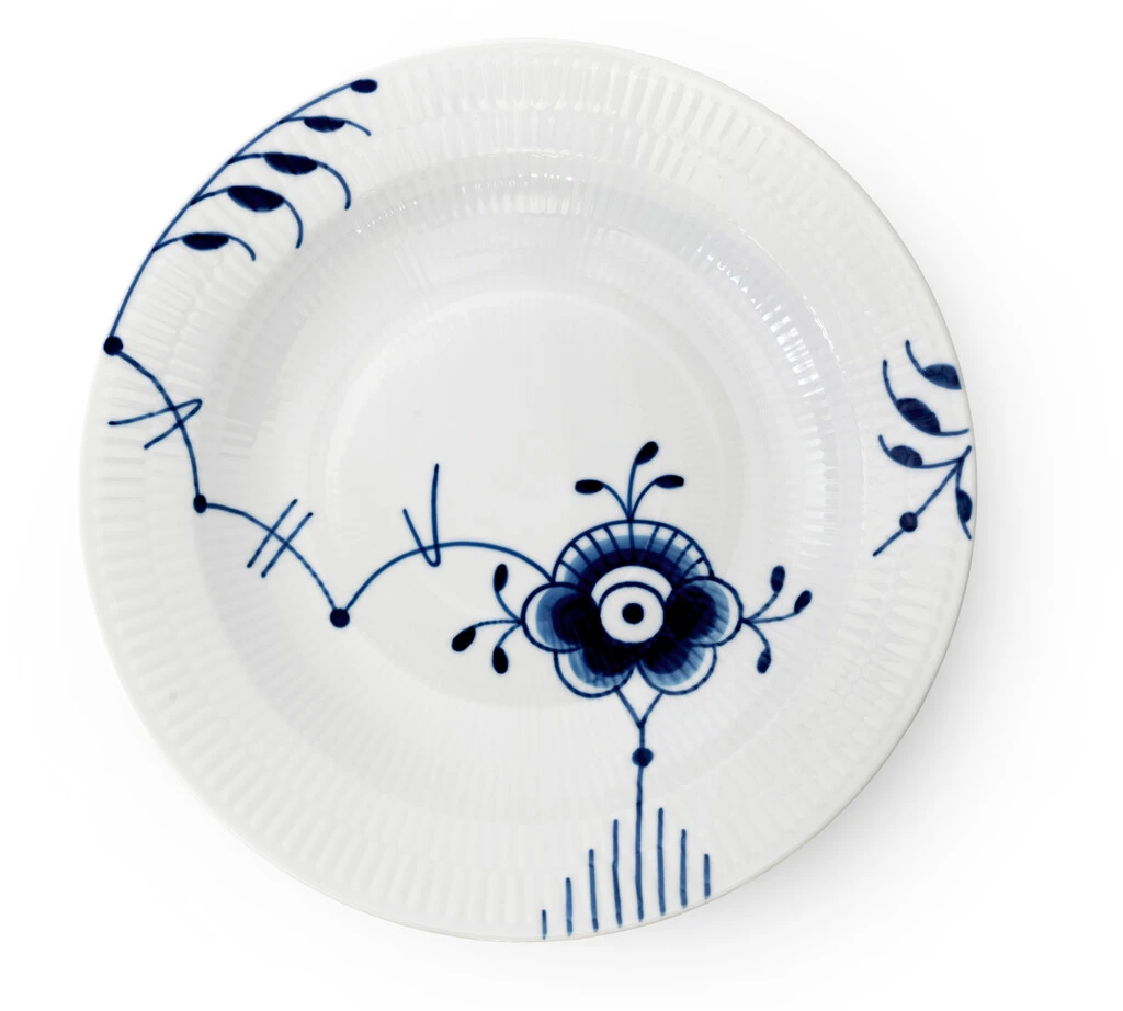 De håndmalede koboltblå dekorationer ser smukke ud på denne Blå Mega Riflet dybe tallerken. Blå Mega Riflet-mønsteret blev skabt i 2000 af Karen Kjælgård-Larsen og er blevet et ægte Royal Copenhagen-ikon.