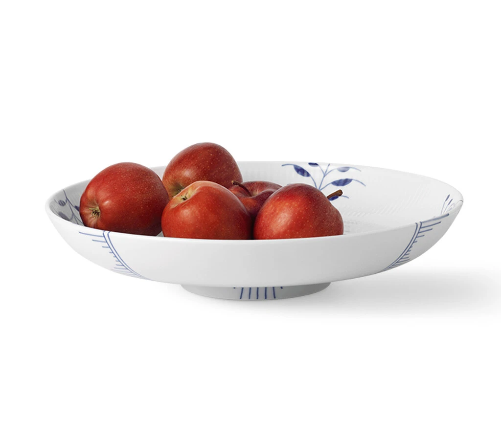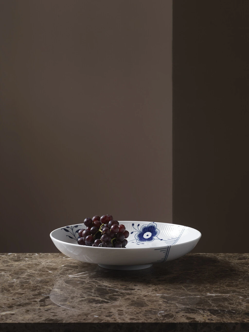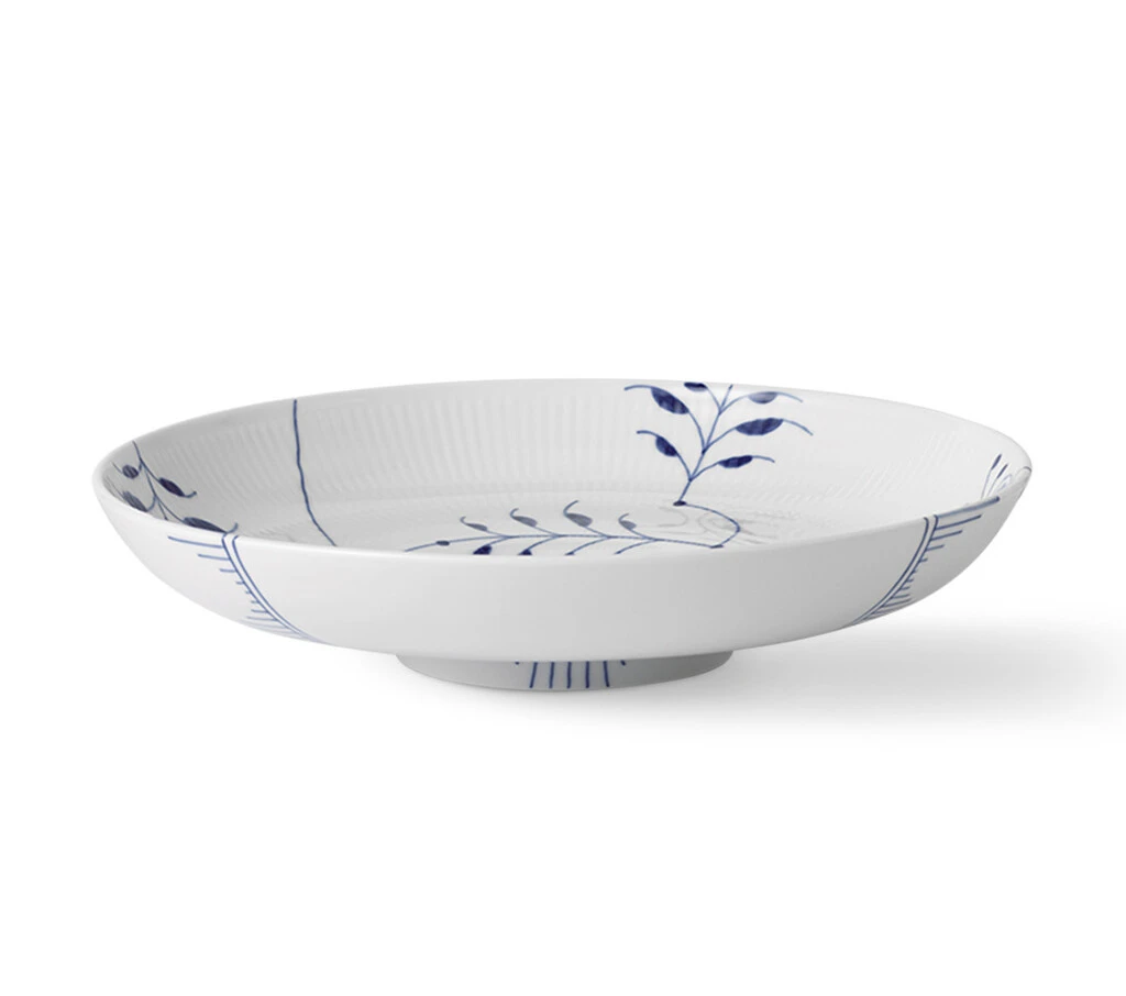 Den store Blå Mega Riflet skål er diskret hævet på en lille søjlefod og er et imponerende omdrejningspunkt, der er smukt i sig selv eller er oplagt til at blive fyldt med frugt eller en stor salat. Skålen demonstrerer på smukkeste vis Blå Mega Riflet-mønsteret og er en uundværlig tilføjelse til en samling af Blå Mega Riflet.