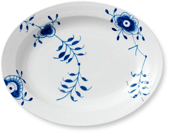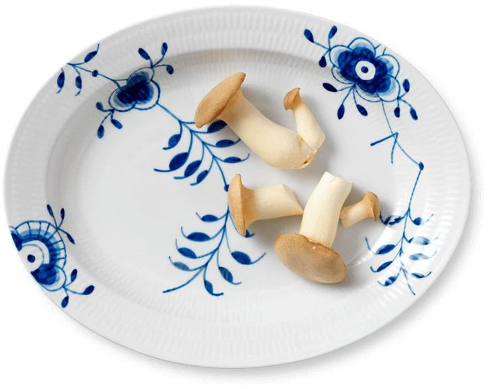 Den unge designstuderende, Karen Kjældgård-Larsen, præsenterer Royal Copenhagen for en dristig idé: En dramatisk nyfortolkning af det klassiske Musselmalede stel. Hendes design bryder alle traditioner samtidig med, at det håndmalede håndværk er bevaret. Forstørrelsen af det klassiske mønster skaber et ekstraordinært og enestående udtryk, hvor det oprindelige mønster stadig er genkendeligt. Musselmalet Riflet er genfødt. Med denne genfødsel har mønstret fra 1775 gennemgået en udvikling, og en moderne klassiker er født. Et eksklusivt fad med smukke blåmalede detaljer. Det Blå Mega Riflede fad egner sig fantastisk til et smukt dækket bord eller som dekoration i ethvert af husets rum.