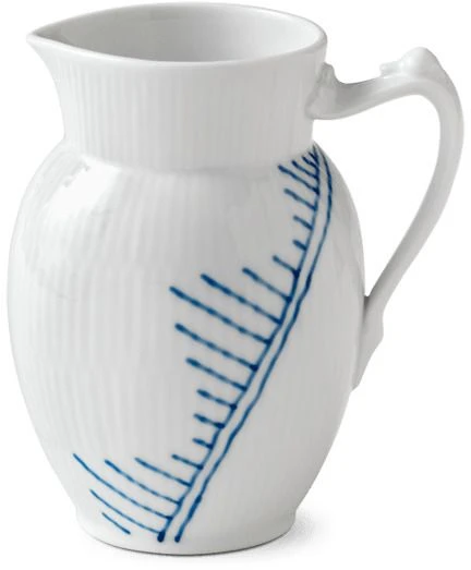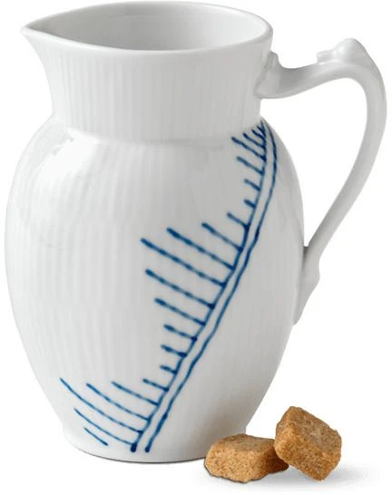 Den unge designstuderende, Karen Kjældgård-Larsen, præsenterer Royal Copenhagen for en dristig idé: En dramatisk nyfortolkning af det klassiske Musselmalede stel. Hendes design bryder alle traditioner samtidig med, at det håndmalede håndværk er bevaret. Forstørrelsen af det klassiske mønster skaber et ekstraordinært og enestående udtryk, hvor det oprindelige mønster stadig er genkendeligt. Musselmalet Riflet er genfødt. Med denne genfødsel har mønstret fra 1775 gennemgået en udvikling, og en moderne klassiker er født. Den lille flødekande er en klassisk del af det oprindelige Musselmalede stel. De forstørrede blåmalede detaljer ved det Blå Mega Riflede mønster giver den det kendte elegante udtryk, der gør den perfekt til ethvert kaffebord.