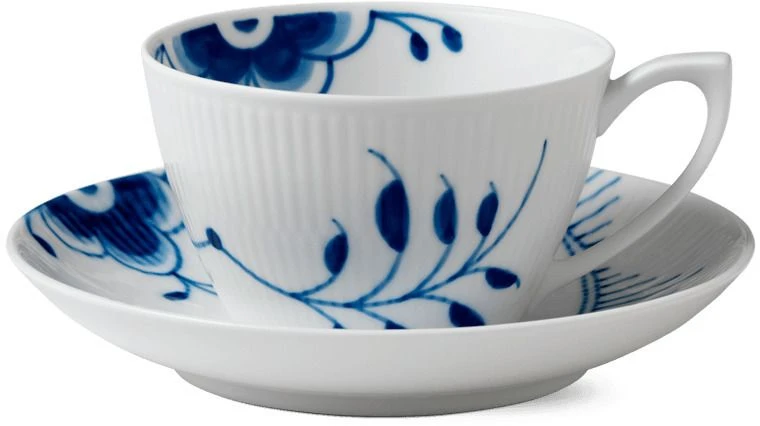 Den unge designstuderende, Karen Kjældgård-Larsen, præsenterer Royal Copenhagen for en dristig idé: En dramatisk nyfortolkning af det klassiske Musselmalede stel. Hendes design bryder alle traditioner samtidig med, at det håndmalede håndværk er bevaret. Forstørrelsen af det klassiske mønster skaber et ekstraordinært og enestående udtryk, hvor det oprindelige mønster stadig er genkendeligt. Musselmalet Riflet er genfødt. Med denne genfødsel har mønstret fra 1775 gennemgået en udvikling, og en moderne klassiker er født. Eftermiddagsteen kan fuldt ud nydes med denne elegante tekop i Blå Mega Riflet. Porcelænskoppen har en enkel, let spidset hank samt en klassisk underkop, der gør den både moderne og tidløs.