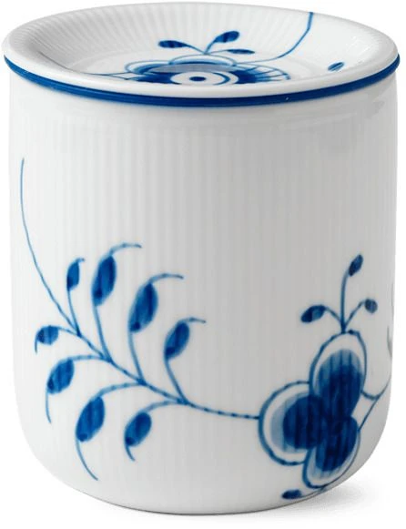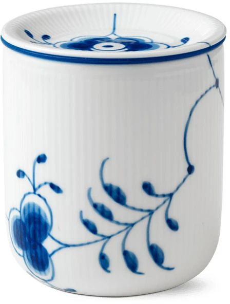 Den unge designstuderende, Karen Kjældgård-Larsen, præsenterer Royal Copenhagen for en dristig idé: En dramatisk nyfortolkning af det klassiske Musselmalede stel. Hendes design bryder alle traditioner samtidig med, at det håndmalede håndværk er bevaret. Forstørrelsen af det klassiske mønster skaber et ekstraordinært og enestående udtryk, hvor det oprindelige mønster stadig er genkendeligt. Musselmalet Riflet er genfødt. Med denne genfødsel har mønstret fra 1775 gennemgået en udvikling, og en moderne klassiker er født. Denne opbevaringskrukke er både elegant og funktionel. Omkring låget er påført en silikonering, der sørger for, at det lukker tæt. Det smukke Blå Mega Riflede mønster giver den et enkelt udtryk, og porcelænskrukken passer dermed ind i ethvert af husets rum.