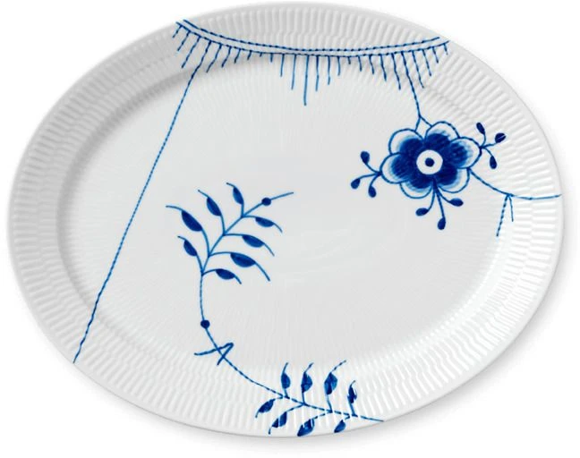 Den unge designstuderende, Karen Kjældgård-Larsen, præsenterer Royal Copenhagen for en dristig idé: En dramatisk nyfortolkning af det klassiske Musselmalede stel. Hendes design bryder alle traditioner samtidig med, at det håndmalede håndværk er bevaret. Forstørrelsen af det klassiske mønster skaber et ekstraordinært og enestående udtryk, hvor det oprindelige mønster stadig er genkendeligt. Musselmalet Riflet er genfødt. Med denne genfødsel har mønstret fra 1775 gennemgået en udvikling, og en moderne klassiker er født. Et eksklusivt fad med smukke blåmalede detaljer. Det Blå Mega Riflede fad egner sig fantastisk til et smukt dækket bord eller som dekoration i ethvert af husets rum.