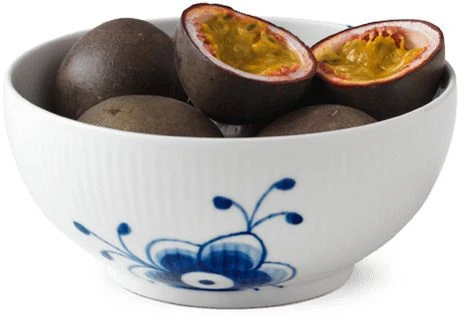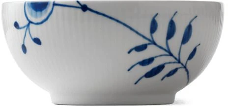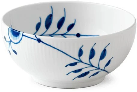 Den unge designstuderende, Karen Kjældgård-Larsen, præsenterer Royal Copenhagen for en dristig idé: En dramatisk nyfortolkning af det klassiske Musselmalede stel. Hendes design bryder alle traditioner samtidig med, at det håndmalede håndværk er bevaret. Forstørrelsen af det klassiske mønster skaber et ekstraordinært og enestående udtryk, hvor det oprindelige mønster stadig er genkendeligt. Musselmalet Riflet er genfødt. Med denne genfødsel har mønstret fra 1775 gennemgået en udvikling, og en moderne klassiker er født. Den enkle porcelænsskål er både funktionel og elegant. Skålen er smukt dekoreret med det Blå Mega Riflede mønster, og det kendte yndefulde udtryk gør den til et smukt element i alle husets rum.
