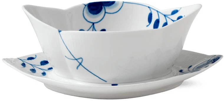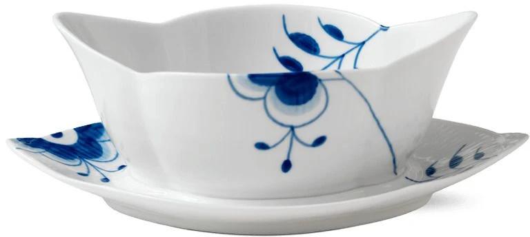 Den unge designstuderende, Karen Kjældgård-Larsen, præsenterer Royal Copenhagen for en dristig idé: En dramatisk nyfortolkning af det klassiske Musselmalede stel. Hendes design bryder alle traditioner samtidig med, at det håndmalede håndværk er bevaret. Forstørrelsen af det klassiske mønster skaber et ekstraordinært og enestående udtryk, hvor det oprindelige mønster stadig er genkendeligt. Musselmalet Riflet er genfødt. Med denne genfødsel har mønstret fra 1775 gennemgået en udvikling, og en moderne klassiker er født. Denne smukke sauceskål vil gøre sig elegant på ethvert middagsbord. De elegant formede kanter og de forstørrede blåmalede detaljer er med til at give skålen det kendte klassiske udtryk.