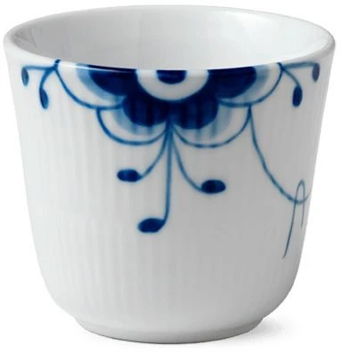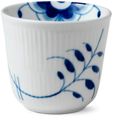 Den unge designstuderende, Karen Kjældgård-Larsen, præsenterer Royal Copenhagen for en dristig idé: En dramatisk nyfortolkning af det klassiske Musselmalede stel. Hendes design bryder alle traditioner samtidig med, at det håndmalede håndværk er bevaret. Forstørrelsen af det klassiske mønster skaber et ekstraordinært og enestående udtryk, hvor det oprindelige mønster stadig er genkendeligt. Musselmalet Riflet er genfødt. Med denne genfødsel har mønstret fra 1775 gennemgået en udvikling, og en moderne klassiker er født. Termokruset i Blå Mega Riflet er med sin enkelhed perfekt til både hverdag og særlige anledninger. Termokruset er sammensat af en indre og en ydre kop, der dermed danner et hulrum, så man undgår, at porcelænet leder varmen.
