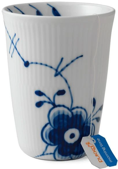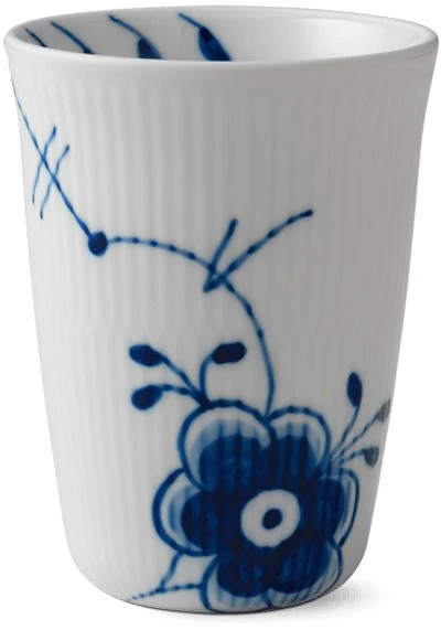 Den unge designstuderende, Karen Kjældgård-Larsen, præsenterer Royal Copenhagen for en dristig idé: En dramatisk nyfortolkning af det klassiske Musselmalede stel. Hendes design bryder alle traditioner samtidig med, at det håndmalede håndværk er bevaret. Forstørrelsen af det klassiske mønster skaber et ekstraordinært og enestående udtryk, hvor det oprindelige mønster stadig er genkendeligt. Musselmalet Riflet er genfødt. Med denne genfødsel har mønstret fra 1775 gennemgået en udvikling, og en moderne klassiker er født. ermokruset i Blå Mega Riflet er med sin enkelhed perfekt til både hverdag og særlige anledninger. Termokruset er sammensat af en indre og en ydre kop, der dermed danner et hulrum, så man undgår, at porcelænet leder varmen.
