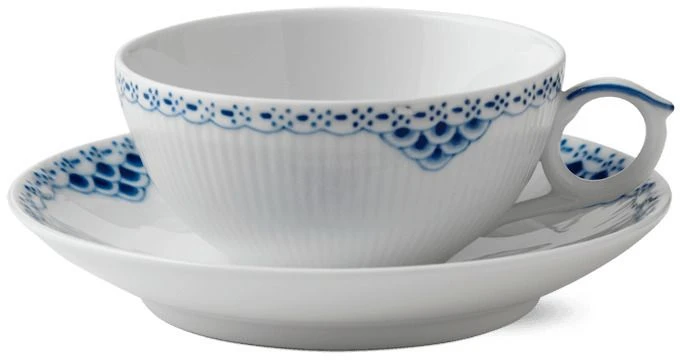 En klassiker fra det 19. århundrede, der er som skabt til vores tid. Kniplingeborten og de blå musseldekorationer på Prinsesse-stellet afslører dets tætte bånd til Royal Copenhagens musselmalede stel. Og det var faktisk også det, der i det 19. århundrede inspirerede Arnold Krog da han designede denne royale, klassiske serie af håndglaserede og håndmalede stel i en mesterlig, traditionel stil.