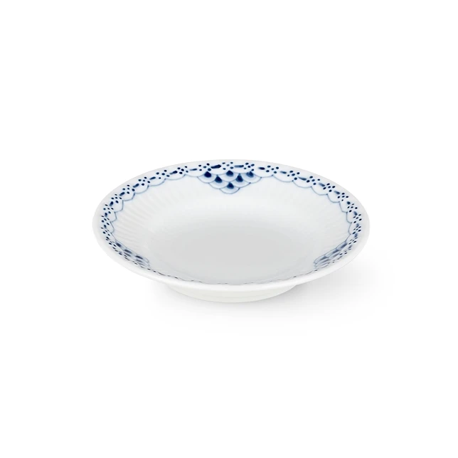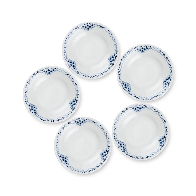 Dette sæt af fem tallerkener er en oplagt gaveidé eller en fin start på, eller udvidelse af, en Royal Copenhagen samling. Tallerkenerne på 11 cm er håndmalede med det romantiske Prinsesse-mønster og er ideelle som asietter eller små tallerkener til en stående buffet. Den feminine blonde og de blå fiskeskælsdekorationer på Prinsesse-stellet afslører et tæt bånd til de musselmalede stel, men alligevel er det feminine stel helt sit eget. Det delikate, klassiske udtryk i stellet kan ubesværet sættes sammen med andre af Royal Copenhagens stel og skabe personlige og nye udtryk.