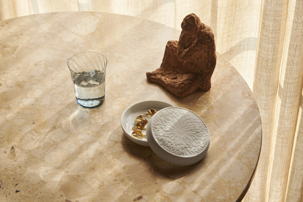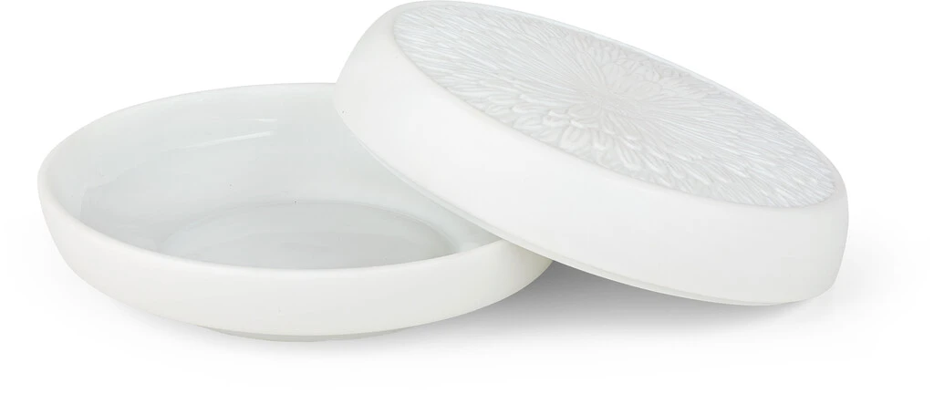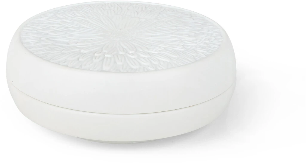 Bonbonnieren er skabt i uglaseret porcelæn i en moderne form. På låget udfoldes et detaljeret og udtryksfuldt Daisy-relief med blomsterblade, der bliver