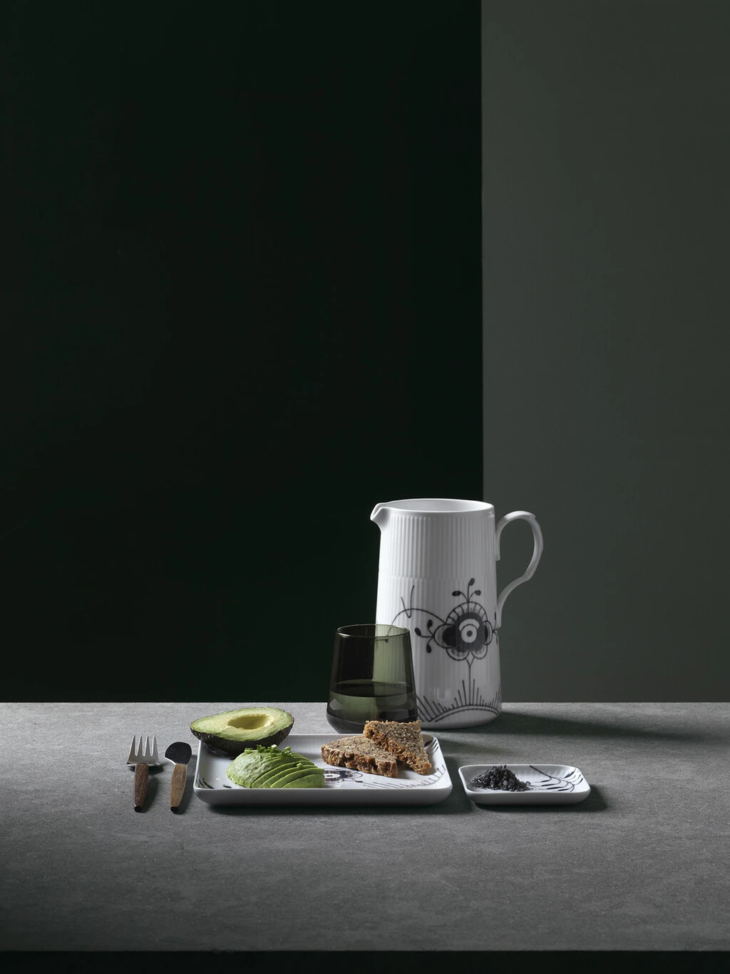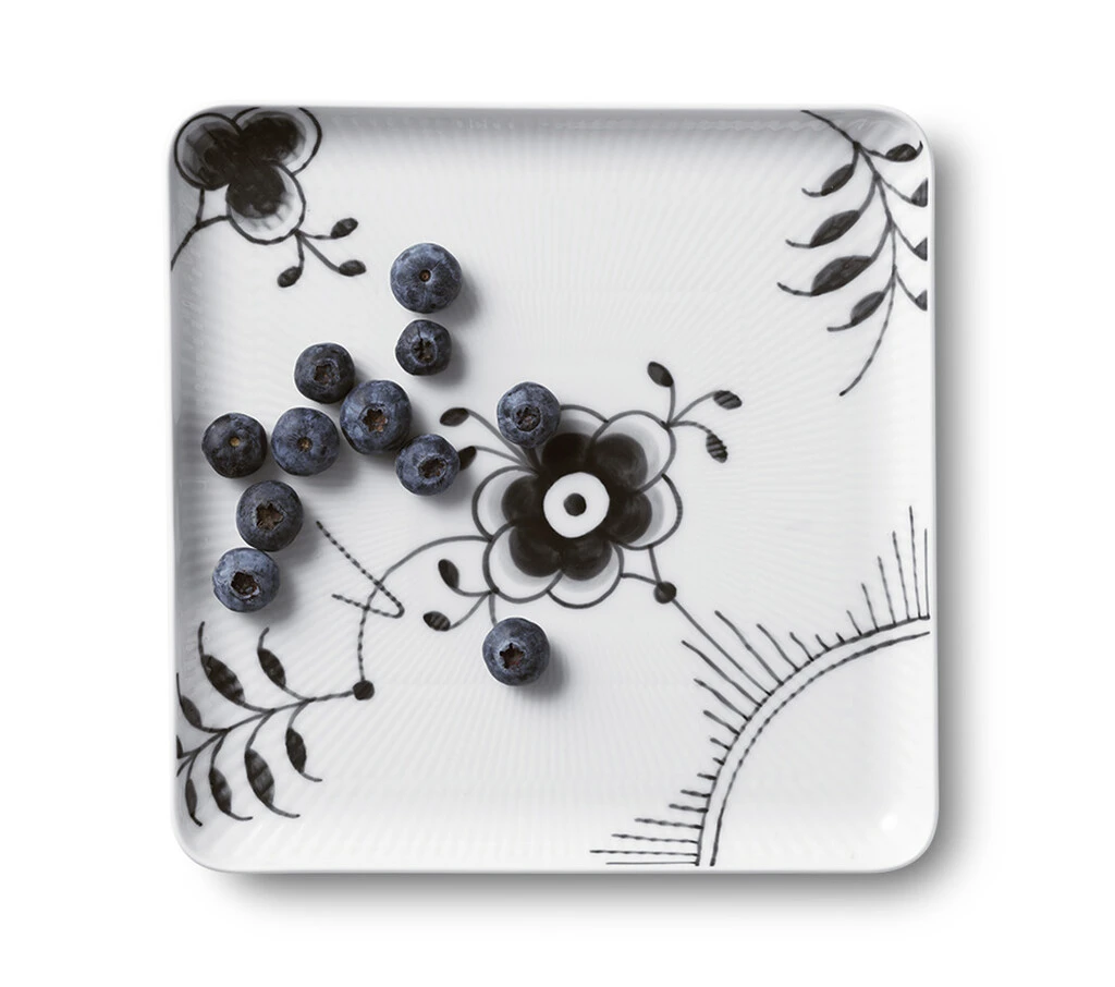 Med en kontemporær form, der er håndmalet med det monokrome mønster fra Sort Mega Riflet, er den største af de to firkantede tallerkener i stellet en moderne fortolkning af klassisk porcelæn. Den større firkantede tallerken er et forfriskende bud på servering af større anretninger eller fællesretter.