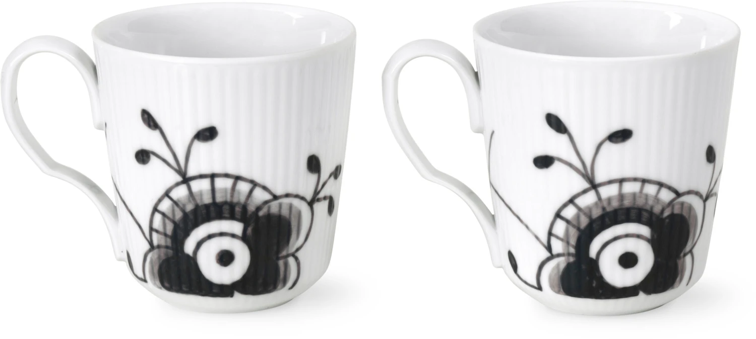 Et gammelt design er blevet nyfortolket i dette 28 cl krus fra Sort Mega Riflet. De håndmalede dekorationer viser smukt de kongelige københavnske håndværkeres ekspertise med de forstørrede elementer fra det klassiske musselmalede mønster. Krusene fra Sort Mega Riflet er ideelle til dem, som elsker en monokrom sort og hvid æstetik. Lad dem være det naturlige valg til din morgenkaffe eller eftermiddagste – eller skab særlige minder for to.